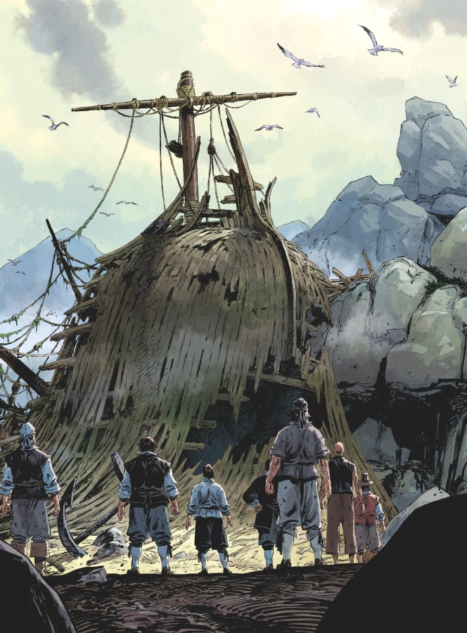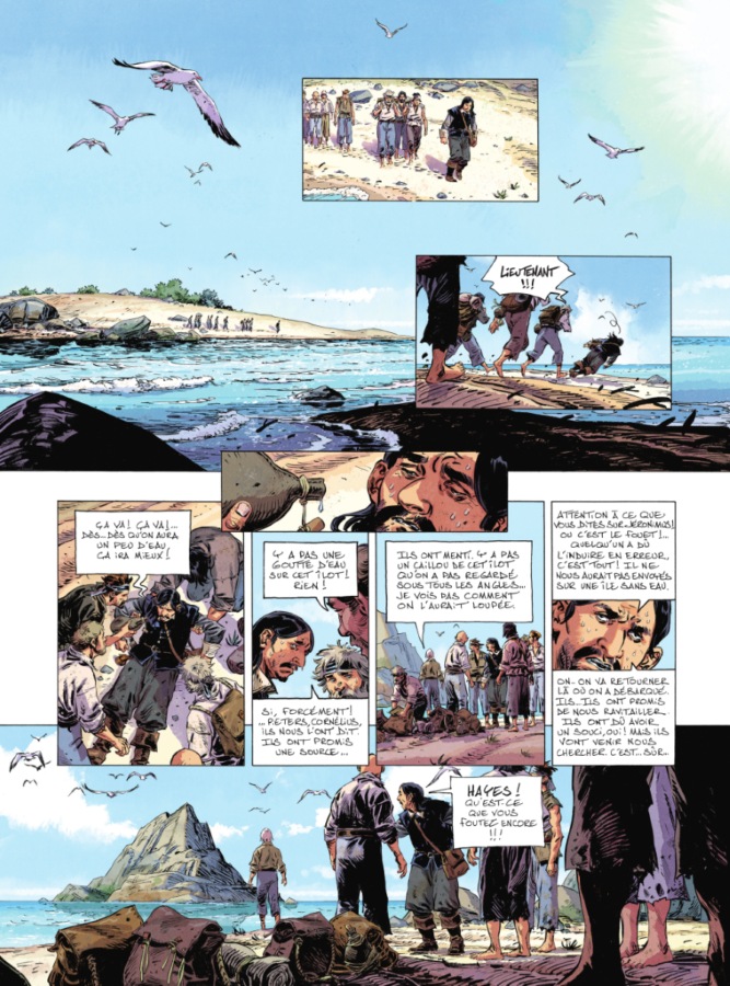 On a l’impression de vivre l’aventure de l’intérieur avec les protagonistes. On ressent leur peur, le froid, la famine, la haine avec des dessins regorgeant de détails sur des planches où les vagues sortent du cadre accompagnant le Jakarta transperçant les cases. La mise en page alterne plans larges immersifs et gros plans psychologiques, renforçant les émotions. On se rapproche d’un storyboard cinématographique. L’approche semi-réaliste de Thimothée Montaigne permet aux lecteurs d’en prendre plein la vue et d’être emportés par une lame de fond qui renverse tout sur son passage. Ne pas oublier la qualité de la mise en couleur de Clara Tessier qui nous fait bien ressentir la crasse et les conditions de vie extrêmes que cela soit sur le navire ou sur l’île.