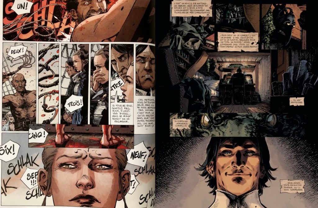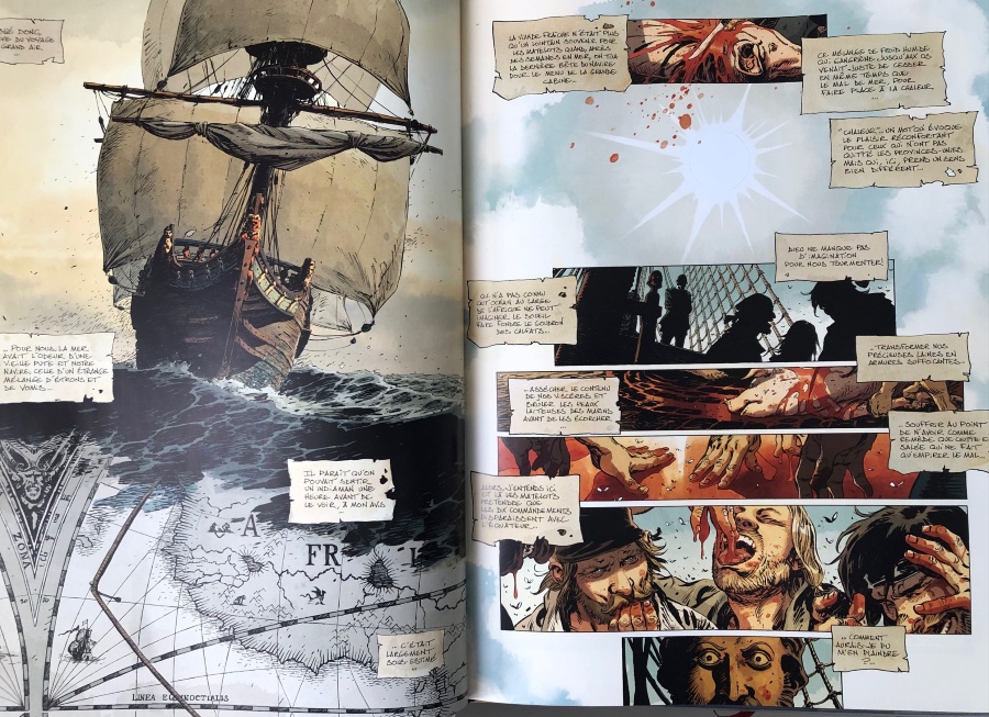 Avec beaucoup d’intelligence, Xavier Dorison (Goldorak) prend le temps d’installer son histoire. Le premier tome présente les enjeux et installe les différents protagonistes du drame en devenir. Cette première partie plonge le lecteur dans un cours d’histoire passionnant sur les raisons des voyages maritimes commerciaux et la lutte des classes. Dans ce huis clos maritime, mouvant mais pas moins angoissant, la tension monte et les esprits s’échauffent jusqu’au naufrage. Le second tome, alors, attaque tambour battant. Entre naufragés, les cartes sont rebattues dans un nouveau huis clos encore plus angoissant où cette fois-ci, c’est la barbarie humaine qui s’exprime sans retenue. Afin de donner du rythme, les 2 albums sont découpés en chapitres, 6 pour le premier et 5 pour le second, introduits à chaque fois par des gravures pour mieux nous immerger dans l’époque. La progression passe de l’ordre (règles) au chaos (absence de règles) dans un tempo crescendo et une ambiance sombre et glaçante.