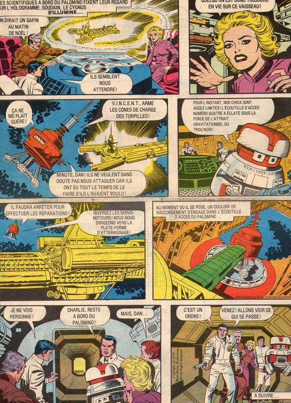 Des robots rigolos, un robot méchant, et ce type qui débarquait avec deux pistolets lasers pour buter du vilain robot pourpre aux têtes de soupières, comme un Yan Solo déchaîné contre des gardes impériaux dont mon jeune esprit n’avait toujours pas capté que non, ce n’étaient pas des robots… LE TROU NOIR avait été vendu comme un digne successeur de LA GUERRE DES ÉTOILES !
