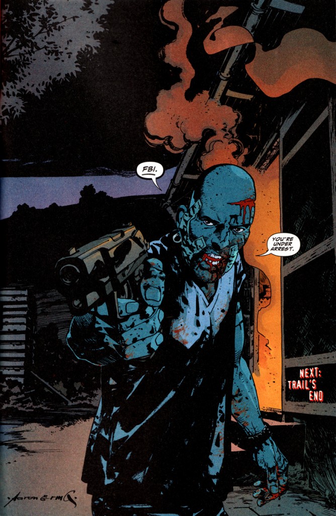Bon ok je n’ai lu que 3 tomes, ça va surement empirer. Mais même si c’est bien évidemment horrible ce qui se passe dans ces réserves, je n’ai encore pas ressenti chez Aaron le désespoir que Ennis peut faire naitre en moi. Le thème est peut être noir, mais Ennis peut me faire déprimer en me racontant une histoire de « Ghost Rider la vallée des larmes » Quand Ennis veut être noir, il me prend aux tripes. Même quand il est censé être drôle, il me fait peur alors bon…