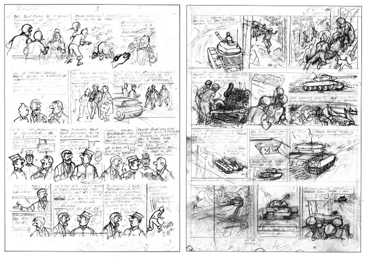 J’ai apprécié ton analyse graphique de l’album (la genèse je l’ai déjà à la maison dans mes propres ouvrages). La planche d’esquisse sur le char est juste extraordinaire. Le choix de celle avec le sparadrap est un modèle du genre en terme de narration graphique.