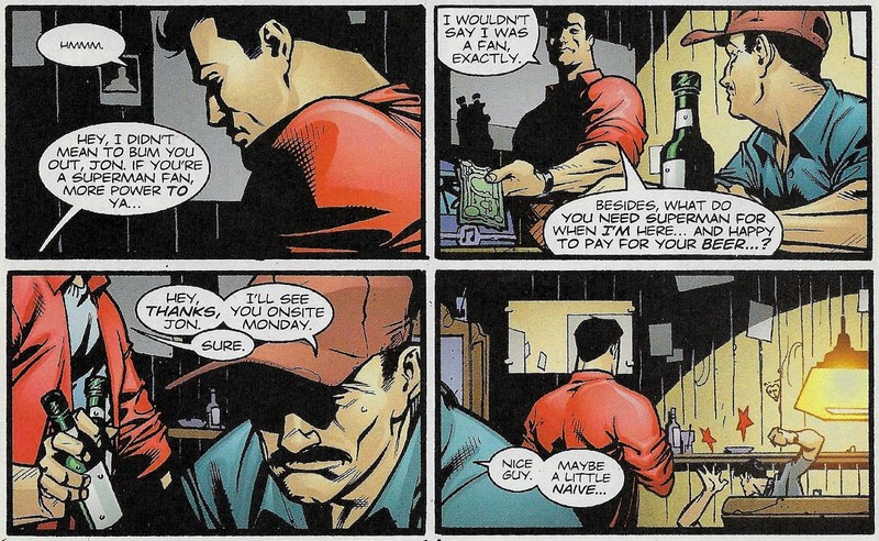 Comme l’a rappelé notre cher Alex Nikolavitch, Superman est à l’origine un héros très social, et lutte pour les démunis. Dans cet ancien numéro d’ACTION COMICS, il présente les conditions précaires des mineurs à leur patron. L’idée est un peu différente ici : l’objectif est de montrer que Superman, perçu comme un mythe ou un être trop au-dessus de la foule fait partie de l’humanité, en se joignant à l’équipe de mineurs pour la tournée des bars.