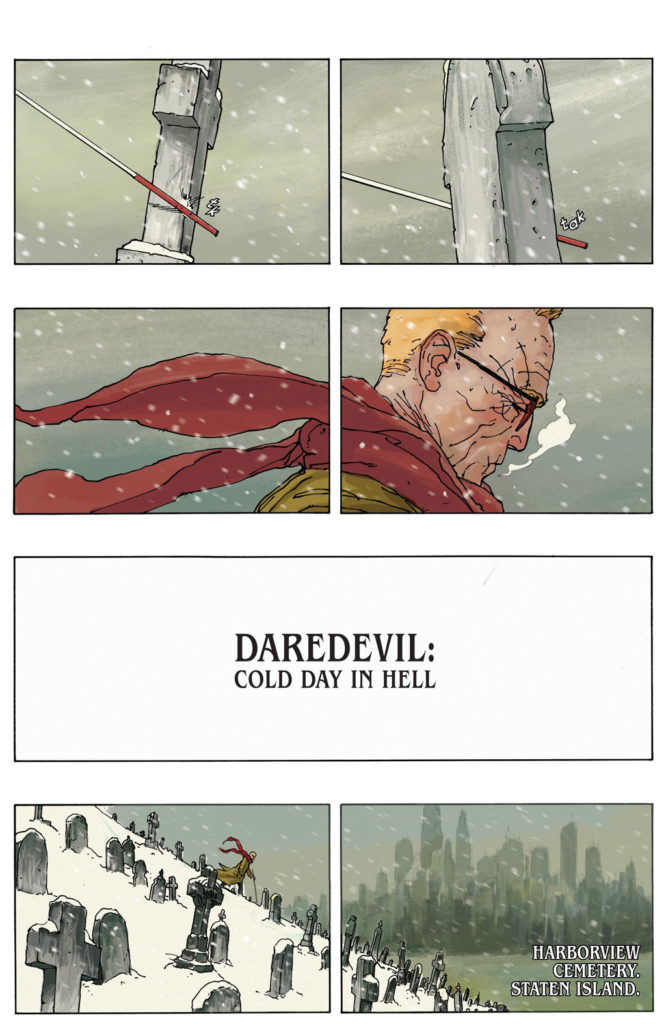 Par un temps neigeux, Matt Murdock vient se recueillir devant la tombe de… Elektra ou Wilson Fisk ?