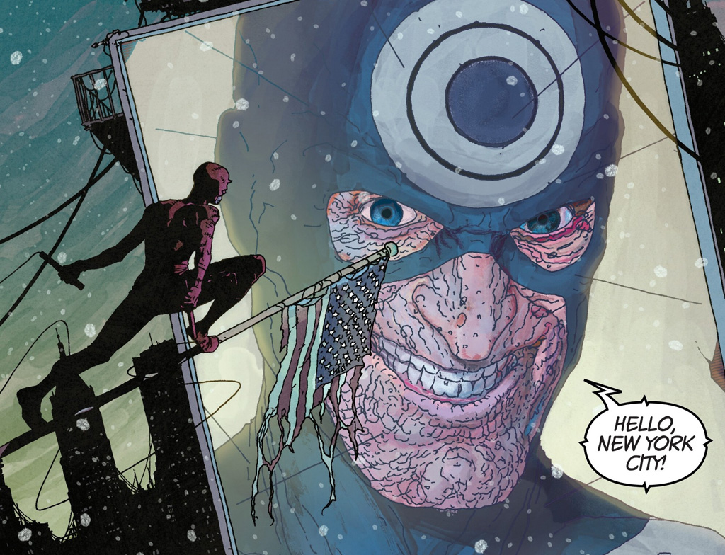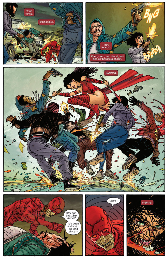 Si le début est plutôt intéressant, puisque au moins Charles Soule nous évite la confrontation Matt/Wilson Fisk, il ne peut s’empêcher de ramener des personnages secondaires emblématiques qui gravitent depuis des années autour du personnage. Mais encore une fois, il n’explique ni leur présence, ni leurs intentions. Elektra vient donner un coup de main… parce qu’elle voit Matt déambuler dans le ciel. Et elle disparait aussi sec. Ça permet juste à McNiven de pomper le style de Miller dans ELEKTRA RENAIT À LA VIE mais en termes d’avancée dans le scénario, cela n’a aucun intérêt. Elle sauve certes Matt de la mort, mais sans autre raison que parce qu’elle était dans le coin à ce moment-là. On ne sait pas non plus pourquoi le PUNISHER est retenu prisonnier par le TIREUR et ce qui a conduit à ses mutilations. CAPTAIN AMERICA vient faire un tour et disparaît. C’est lui qui lance l’histoire. Alors j’entends bien qu’il y a quand-même un lien entre les deux personnages (notamment sous Miller dans BORN AGAIN ou bien dans un épisode inédit en France de Ann Nocenti) mais pourquoi ne pas avoir choisi Spider-Man ? Qui a une histoire beaucoup plus fournie avec Daredevil. Parce que l’armée est peut-être dans le coup ? On n’en saura rien. De fait, la présence de tous ces personnages ne sert encore une fois qu’à rattacher l’histoire à un passé, mais sans que les liens soient forcément associés à ce qu’il se passe. Une sorte de fan service en fait.