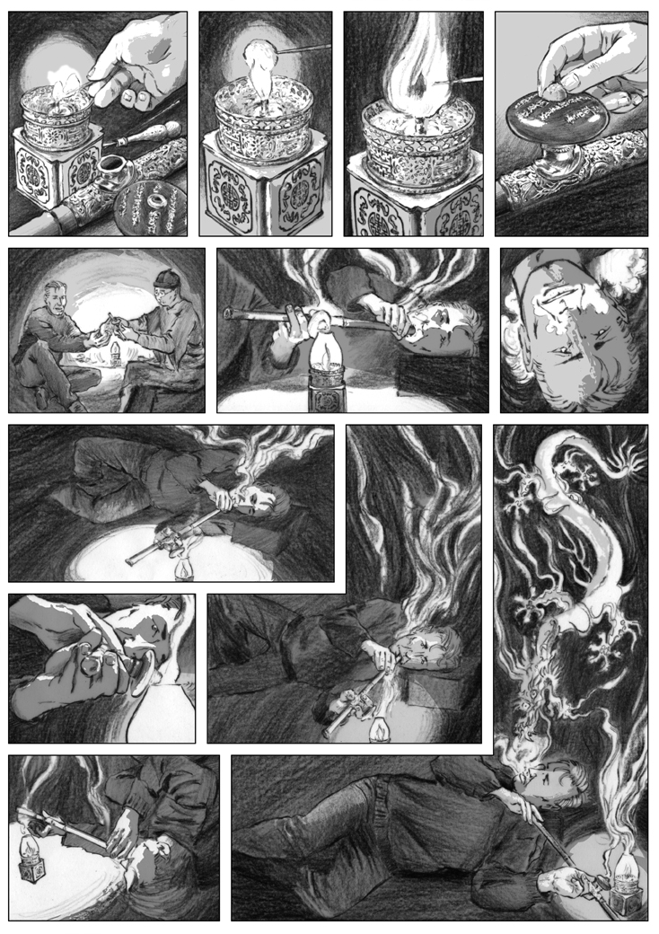 Entre temps, Hergé aidé par les beaux décors mis en scène par Colonnier, visite l’exposition universelle de Bruxelles, teste une fumerie d’opium pour coller à son sujet, fait l’amour à sa femme avant d’apprendre sa stérilité due à une irradiation importante aux rayons X. Le Belge est décrit comme un esprit en perpétuel éveil, curieux de tout, en proie à de fort sentiments conflictuels envers sa femme dont il aimerait divorcer et sa mère dont la mélancolie le terrorise.