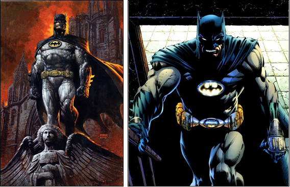 Cette représentation plus pragmatique sera poussée encore un peu plus loin par David Finch dans la série « Dark Knight », avec la représentation d’un Batman brutal et fonceur, que certains lecteurs qualifient d’über-Batman. Dans le cadre de projets très spéciaux, les dessinateurs accentueront encore le degré de réalisme, tels Lee Bermejo (à gauche) ou Gary Frank (à droite), avec des éléments vestimentaires piochés dans des catalogues de sport ou d’armement.