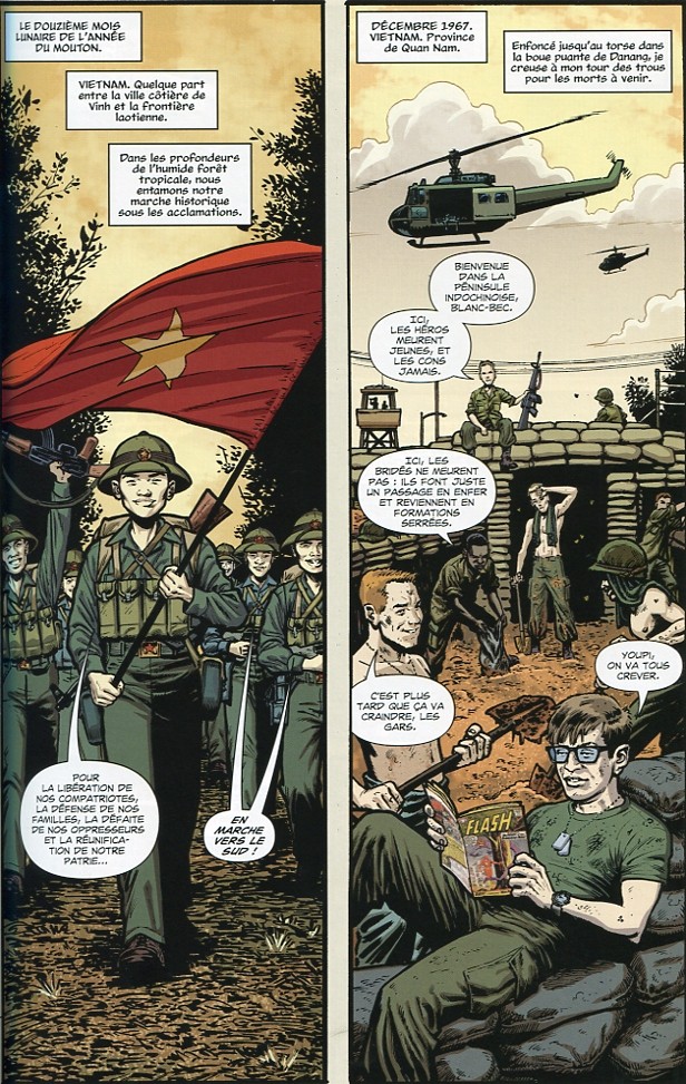 Jason Aaron, Cameron Stewart et Dave McCaig font œuvre d’auteur avec ce récit sur la guerre du Viêt Nam. Contrairement à mon appréhension, ils n’ont pas choisi la facilité en mettant en scène un soldat américain et un soldat vietnamien et en les plaçant en situation de combat. Le récit sort du lot du simple récit d’aventures plus ou moins orienté en faveur des États-Unis, tout d’abord grâce à la qualité des recherches préparatoires qui assurent une qualité historique satisfaisante. Ensuite, il sort du lot par la volonté de montrer les 2 côtés du conflit, l’autre côté, celui de l’ennemi, le FNL, mais aussi l’armée américaine. La narration visuelle implique le lecteur par sa densité et sa force émotionnelle sans verser ni dans le pathos, ni dans l’exagération romantique, ni dans le gore. Le scénario sait combiner l’horreur physique de la guerre, avec l’histoire personnelle assez banale de 2 jeunes gens, et avec l’effet annihilant de la mort violente sur toute forme d’idéologie, même son absence.