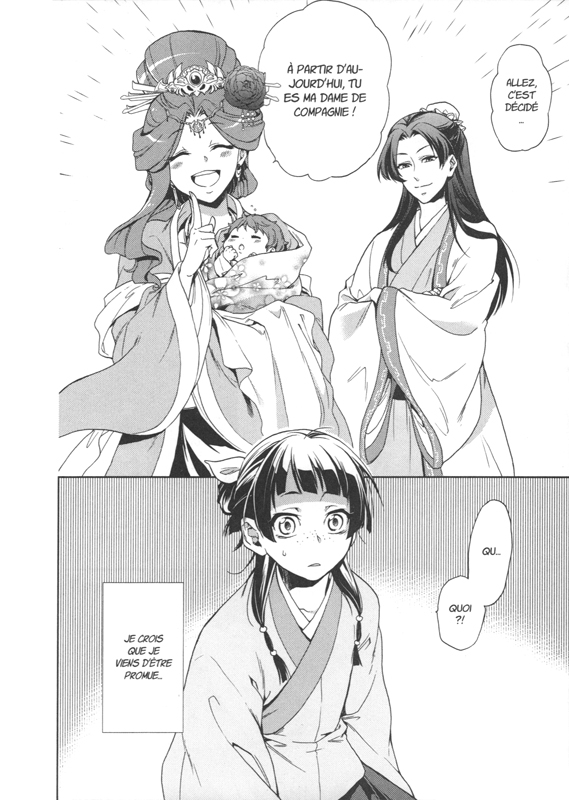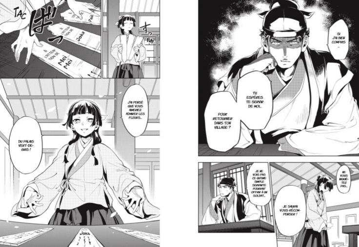 Autour de ces deux-là gravite toutes une galerie de personnes aussi variés qu’attachant. Chacun a un rôle à jouer au sein de cette cour. Il y a Gyokuyo, la concubine douce et élégante mais qui cache une vraie force derrière ses airs délicats et toujours bienveillante envers Mao Mao, et Shaolan, la servante pleine d’énergie, un peu maladroite mais au grand cœur, connue pour rapporter tous les potins de la cour intérieur.