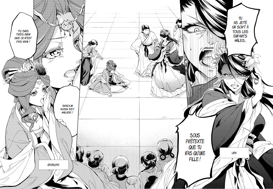 Autour de ces deux-là gravite toutes une galerie de personnes aussi variés qu’attachant. Chacun a un rôle à jouer au sein de cette cour. Il y a Gyokuyo, la concubine douce et élégante mais qui cache une vraie force derrière ses airs délicats et toujours bienveillante envers Mao Mao, et Shaolan, la servante pleine d’énergie, un peu maladroite mais au grand cœur, connue pour rapporter tous les potins de la cour intérieur.