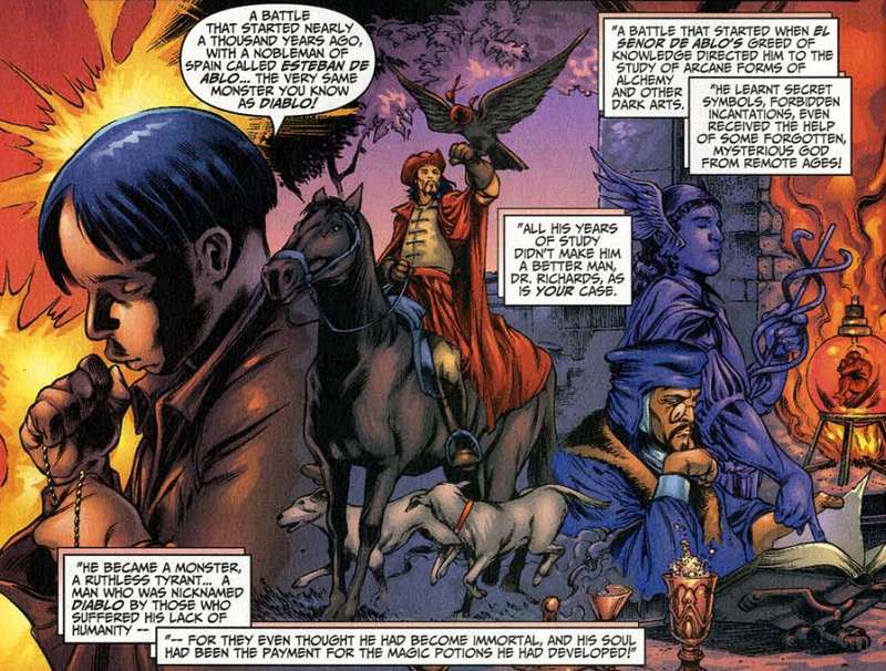 JB : En parlant de leur début, leur premier ennemi est un paradoxe. Les Fantastiques de Pacheco commencent en affrontant Diablo (euh, pas le farfadet téléporteur mutant, hein, le sorcier alchimiste du IXe siècle) plutôt qu’un Fatalis. Un choix qui semble étonnant de prime abord, mais Esteban Diablo aura également marqué les débuts des runs de John Byrne et de Steve Englehart sur la série. Finalement logique lorsque l’on considère que les Fantastiques représentent les 4 éléments (eau, terre, feu, air) qu’invoque Diablo pour ses sortilèges : Pacheco va utiliser ce parallèle dans son intrigue. L’auteur semble également intéressé par l’histoire de ce méchant finalement assez secondaire, en reliant par exemple ses origines au Dracula de Wolfman et en créant un ordre mystique ennemi du sorcier, les Diacres. Une approche qui me semble assez bien résumer l’écriture par Pacheco des vieux ennemis des Fantastiques. Un reste de sa collaboration avec Busiek sur Avengers Forever, peut-être…