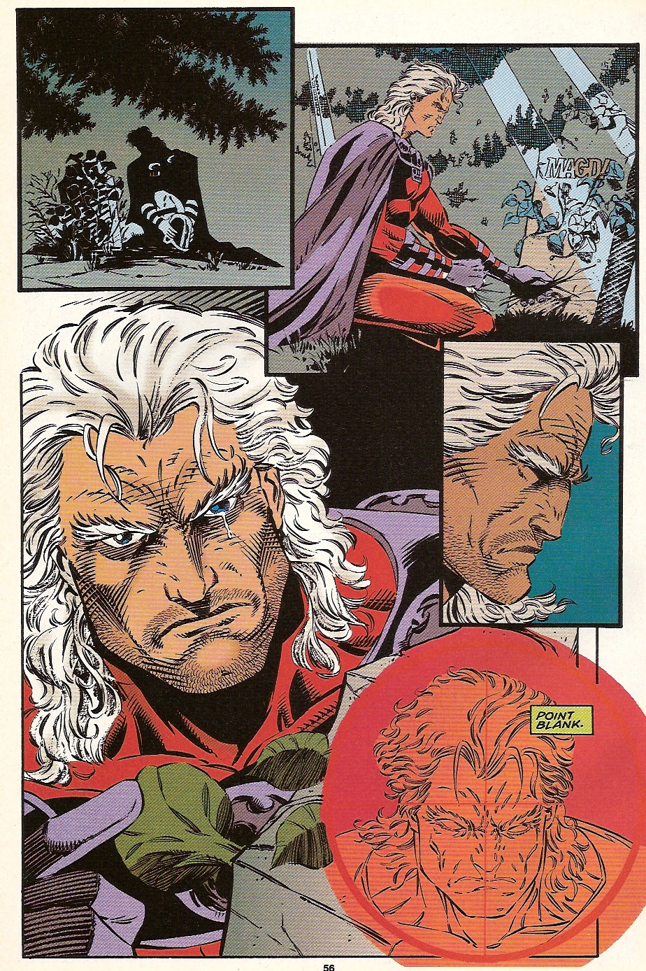 Magneto quant à lui est un homme bon , qui n’a pas eu le courage de vaincre ses démons. Nicieza et Lobdell écrivent un personnage qui a une longueur d’avance sur Charles Xavier : celui-ci a mis la violence entre parenthèses pendant son séjour parmi les X-Men. Alors que l’ancien terroriste a essayé de se racheter une conduite, les meurtres de mutants continuent, des X-Men sont morts, Illyana agonise…