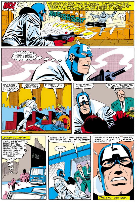 Chez Marvel, Captain America donne lui aussi la mort. Sous John Byrne, il décapite le Baron Blood, un vampire. Mais on pourrait ici arguer que son ennemi était déjà techniquement mort. Ce n’est pas le cas dans CAPTAIN AMERICA n°321. Confronté au groupe terroriste ULTIMATUM, Cap voit l’un de ses membres ouvrir le feu sur des otages et doit lui-même l’abattre. Un usage de la force dans un cas de force majeure, qui va devenir le principal cas d’utilisation d’une force mortelle pour les héros DC et Marvel : Superman utilise toute sa force contre Doomsday pour l’empêcher de raser Metropolis