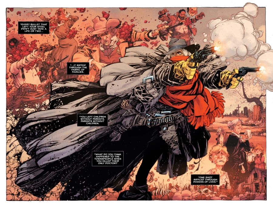 La quête de Ryder peut s’appuyer sur une équipe graphique solide en la personne de Jorge Corona (dessin) et Jean-François Beaulieu (colorisation). Le trait énergique de Jorge Corona (FEATHERS, TRANSFORMERS) est à mi-chemin entre celui du scénariste, Skottie Young (I HATE FAIRY LAND) et de Humberto Ramos (X-MEN, SPIDER-MAN). Les compositions des planches varient en s’alignant sur le tempo de la narration et l’humeur, souvent massacrante, de Ryder : cases verticales, découpages classiques avec des cases aux formats variés, splash pages pour n’en citer que quelques-unes.