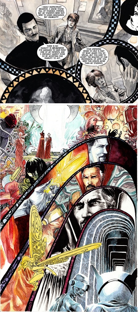 – On termine la compilation avec un one shot publié en 2014 (New Avengers Annual # 1), intitulé « Automédication ». Le scénariste Frank Barbiere et le dessinateur-illustrateur Marco Rudy imaginent un récit alternant le souvenir douloureux du premier échec de Stephen Strange entant que neurochirurgien avec un combat mené au temps présent contre une entité démoniaque ayant pris possession d’une jeune princesse dans une région reculée du monde (probablement le Tibet). Le récit illustre alors le point jusqu’auquel le personnage est capable d’aller afin de remporter ses combats et d’acquérir davantage de pouvoir, même lorsqu’il s’agit de plonger dans la magie noire…