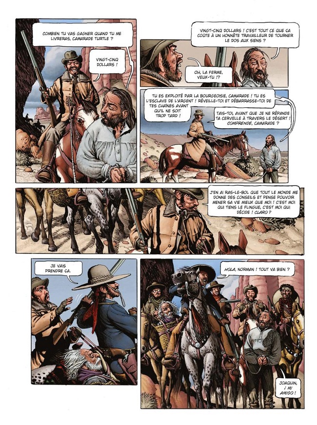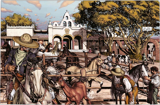 Évidemment, le lecteur un peu familier des westerns sait qu’il va retrouver des images très classiques, cent fois vues. Dans le cadre de la narration visuelle, il n’éprouve pour autant jamais une sensation de redite ou de cliché sans âme. Le dessinateur représente ces éléments avec un niveau de détails qui suffit à les rendre unique. Qui plus est, il réalise des séquences qui les placent dans un contexte, une suite où ces éléments ont du sens, à l’opposé d’un décor de fond sans incidence sur le déroulé du récit. Quand Bass fait passer Jeremiah par la porte de son magasin, ce n’est pas l’image déjà vue mille fois du type qui se fait éjecter de force du bar ou du magasin : c’est un personnage familier du lecteur qui en pousse un autre qu’il va apprendre à connaître, sur un platelage avec une pente, et pas celui habituel des saloons. Quand les hommes de Joaquin Vega font bombance dans la salle à manger de l’hacienda : celle-ci présente des dimensions qui sont crédibles, et non pas extensibles à l’infini pour les besoins de la prise de vue, avec une vaisselle cohérente avec le niveau social de la famille Vega, quand Joaquin s’introduit dans la chambre de Bathsheba, il s’agit d’une pièce avec sa propre décoration, ses propres dimensions, et pas d’une pièce générique avec quatre murs nus. La mise en couleur vient rehausser chaque surface, en accentuant ses reliefs et les ombres portées. Il n’y a que les textures qui sont parfois étrangement absentes, par exemple sur la grande table de la salle à manger.