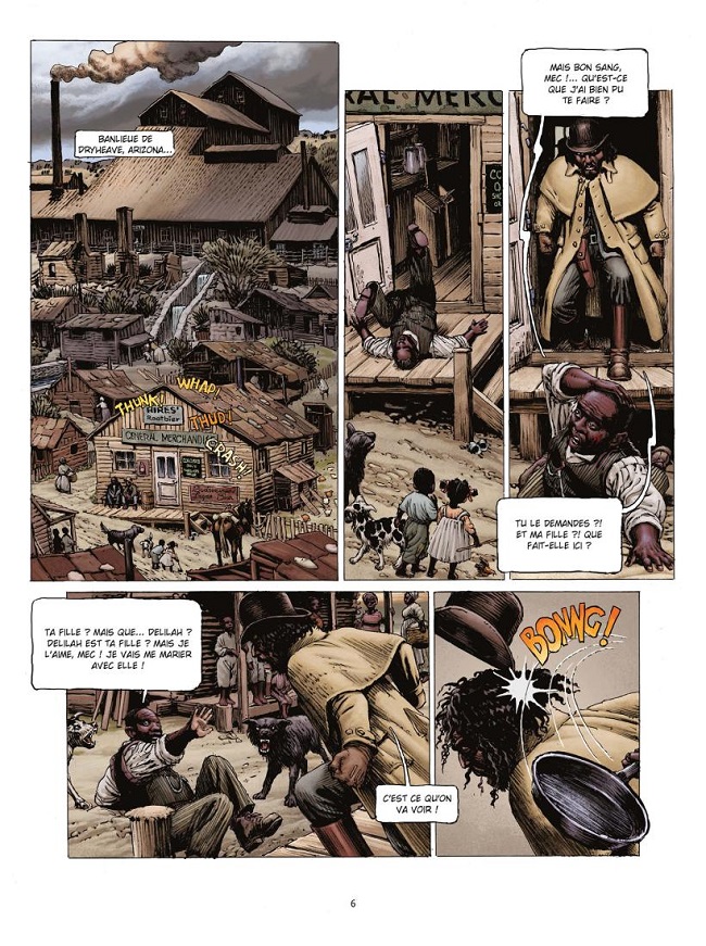 Quoi qu’il en soit, le lecteur veut savoir comment River Bass a pu se fourrer dans la situation montrée par l’illustration de couverture. Dans ce sixième tome, il retrouve toutes les qualités de la série : un western visuellement très consistant. Une narration visuelle semblant évidente, racontant avec évidence et conviction des situations complexes, insufflant du sens dans chaque convention de genre, montrant un monde pleinement réalisé. L’histoire continue de tresser la trame de la vie fictive de River Bass, avec le poids du racisme et de ses effets, la soif d’une forme de la liberté associée aux grands espaces, et en même temps une pulsion de stabilité pour construire durablement. Excellent.