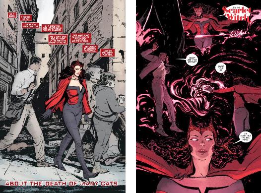 Ce n’est pas la première fois que James Robinson écrit des histoires de sorcières, il l’avait déjà fait pour Vertigo avec Witchcraft illustré par Steve Yeowell, Michael Zulli, Peter Snejbjerg et Teddy Kristiansen. Dans les années 2010, ce scénariste avait recommencé à écrire des histoires de superhéros pour Marvel avec les séries Fantastic Four (à commencer par The fall of the Fantastic Four) et All new Invaders (à commencer par Gods and Soldiers). Après Secret Wars (2015) de Jonathan Hickman & Esad Ribic, James Robinson rempile avec Marvel pour 2 séries : celle de Squadron Supreme et celle-ci. À nouveau il a bien fait son travail de recherche de références. Il évoque dès la première page l’entrée dans le monde des superhéros de Scarlet Witch, ainsi que son rôle à l’occasion de Avengers Disassembled et les révélations récentes sur ses parents dans Axis.