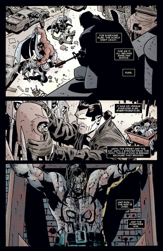 Si JE SUIS UNE LÉGENDE fournit à ce comic book sa structure, il est intéressant d’en comparer la morale. Chez Matheson et dans l’adaptation de 1964, le “héros” finit par se rendre compte que les monstres qu’il traquait ont reconstitué une civilisation et sont la norme et que lui est l’anomalie, leur croquemitaine, le monstre de légende. MARVEL UNIVERSE VS THE PUNISHER a une approche intéressante de cette idée. En effet, il garde l’idée d’une évolution des cannibales, dont certains ont retrouvé une intelligence notable. Mais la conclusion reste également cohérente avec le personnage principal et son regard manichéen sur le monde. En effet, dans les dernières pages, Castle, le dernier humain dans une ville de créatures tueuses, est lui-même qualifié de monstre. Un rôle que, contrairement au personnage de Matheson, il compte embrasser et perpétuer, abandonnant littéralement derrière lui toute trace d’humanité.