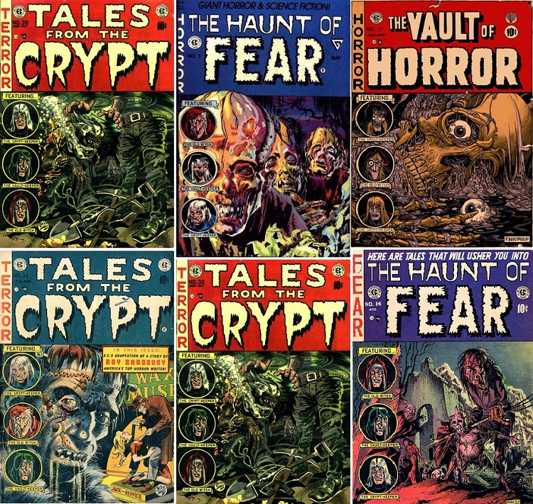 En plus de Weird science et de Weird Fantasy, l’éditeur EC proposait tout un panel d’anthologies dédiées à l’horreur et aux histoires de guerre. On y trouvait ainsi les magazines Shock suspenstories, Crime suspenstories, Haunt of Fear et Vault of Horror dans le domaine de l’épouvante et du thriller, Two-Fisted Tales et Frontline combat dans celui de la guerre. Mais dans l’inconscient collectif, le magazine le plus populaire est sans conteste le célèbre Tales From the Crypt, la goule qui présente chaque histoire de manière truculente y étant probablement pour beaucoup !