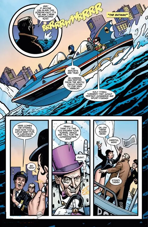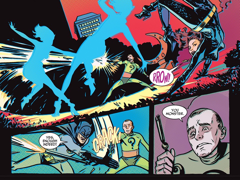 Le concept de ces comics, comme leur nom l’indique, consiste à proposer une adaptation de la série télévisée culte des années 60, avec l’acteur Adam West dans le rôle principal, qui dura 125 épisodes de 1966 à 1968. Chaque dessinateur s’emploie ainsi à reproduire, par le biais de son style graphique, l’ambiance et le look très particulier de la série en question, de même que les histoires et les dialogues de Jeff Parker singent leurs principales caractéristiques. Par ailleurs, la plupart des acteurs interprétant à l’époque le rôle des vilains étaient extrêmement connus et concouraient à un véritable festival de « gueules » (Cesar Romero pour le Joker, Burgess Meredith pour le Pingouin, George Sanders ou Eli Wallach pour Mr Freeze, Vincent Price pour Crâne d’Œuf, Joan Collins pour Siren, Zsa Zsa Gábor pour Minerva, Michael Rennie pour Sandman, le pianiste Liberace pour Chandel, etc.). Du coup, chaque dessinateur s’applique ici à dresser le portrait des vilains, de sorte que l’on reconnaisse, avec plus ou moins de réussite, les acteurs de l’époque. Et tous ressemblent en tout cas à des acteurs déguisés, sans muscles hypertrophiés et sans costumes moulants comme dans les comics mainstream de super-héros…