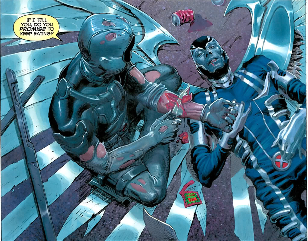 Pour autant, une séquence traumatisante sauve le personnage de toute la saga. Celle où pour sauver un Archangel victime de Famine, Deadpool s’auto-mutile pour donner sa chair à manger à son ami ! La lame de Deadpool pénétrant dans la chair, le soulagement extatique de Warren, tout cela est profondément malsain à l’image de la série. A d’autres reprises, Remender utilise Wade Wilson comme le fou de la série : un type incontrôlable capable de jouer le rôle de substitut parental auprès d’Evan Sabbah Nur.