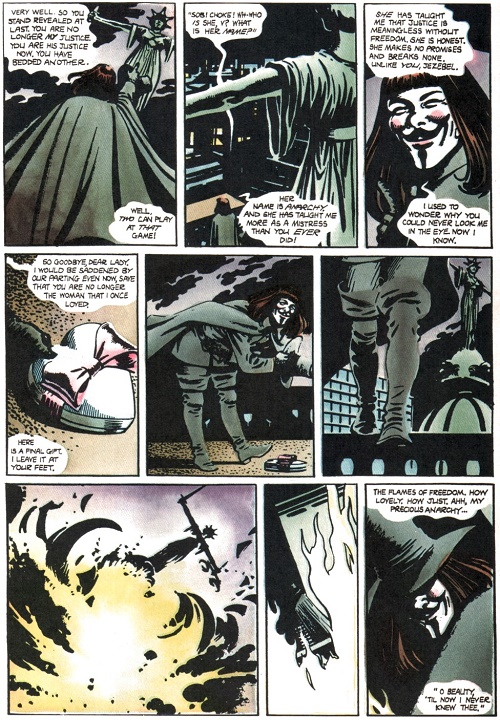 Le film apporte en définitive un postulat opposé, puisque la scène finale voit le peuple tout entier porter le masque de Guy Fawkes, comme s’il passait soudain d’une idéologie à une autre, sans discernement ! Alan Moore & David Lloyd étaient pour le coup beaucoup plus subtils, laissant le lecteur sur une fin plus ouverte, où chacun pouvait choisir sa propre option…